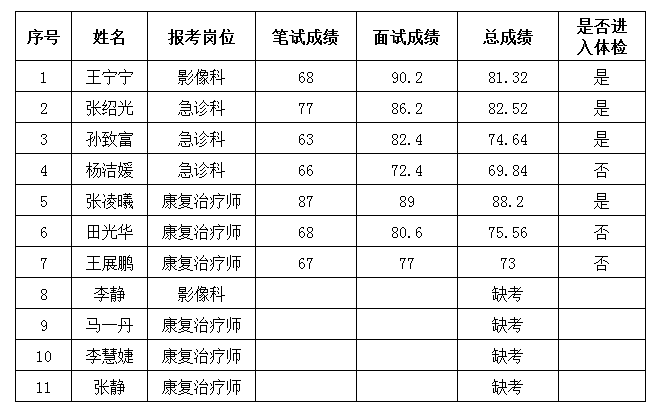我院2020年公開(kāi)招聘工作人員成績(jì)及進(jìn)入體檢程序人員名單公告如下,請進(jìn)入體檢程序的考生于2020年12月9日上午8:00空腹并攜帶身份證到市二院人事科參加體檢,體檢費用自理。