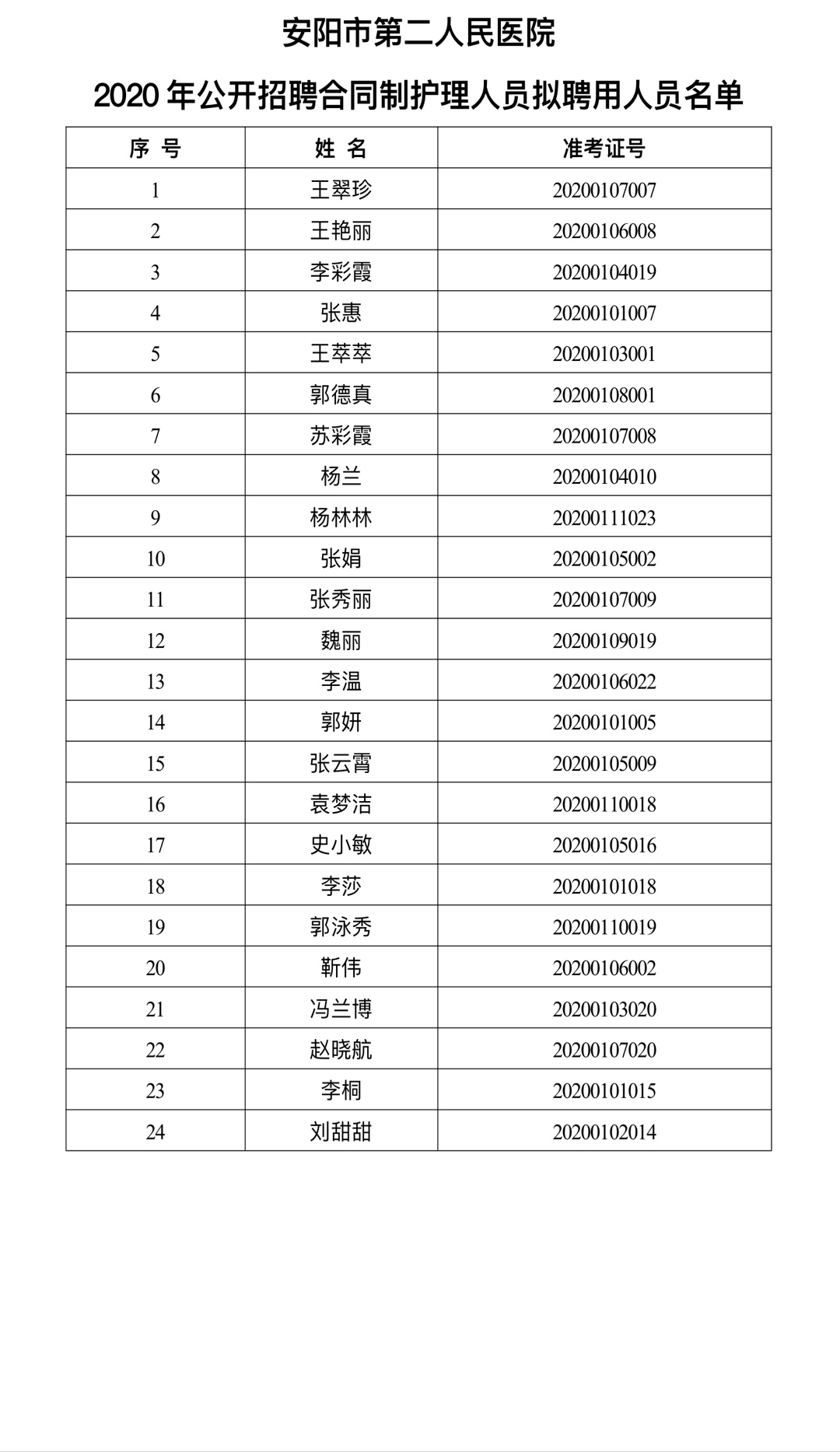 安陽(yáng)市第二人民醫院2020年公開(kāi)招聘合同制護理人員擬聘用人員公告