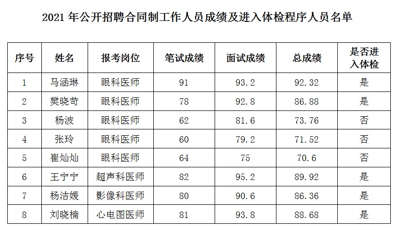 安陽(yáng)市第二人民醫院2021年度公開(kāi)招聘合同制工作人員成績(jì)及進(jìn)入體檢程序人員名單公告