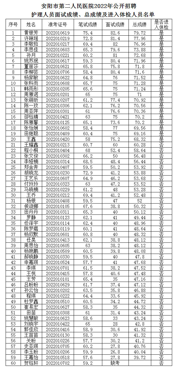 安陽(yáng)市第二人民醫院2022年公開(kāi)招聘護理人員面試成績(jì)、總成績(jì)及進(jìn)入體檢人員公告