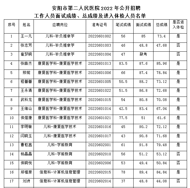 安陽(yáng)市第二人民醫院2022年公開(kāi)招聘工作人員面試成績(jì)、總成績(jì)及進(jìn)入體檢人員公告