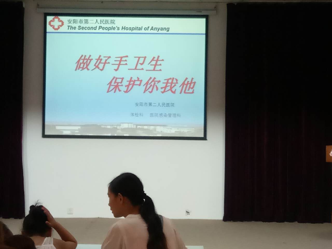 在“洗手歌”歡快的歌聲里,我們開(kāi)始了今天的手衛生知識宣傳,隨著(zhù)世界衛生組織手衛生宣傳片的播放,小朋友和家長(cháng)們不再交頭接耳,會(huì )場(chǎng)很快的安靜下來(lái)。之后,醫院感染管理科方姐姐及健康體檢科鮑姐姐來(lái)到講臺,詳細講解并演示了正確的7步洗手法。
