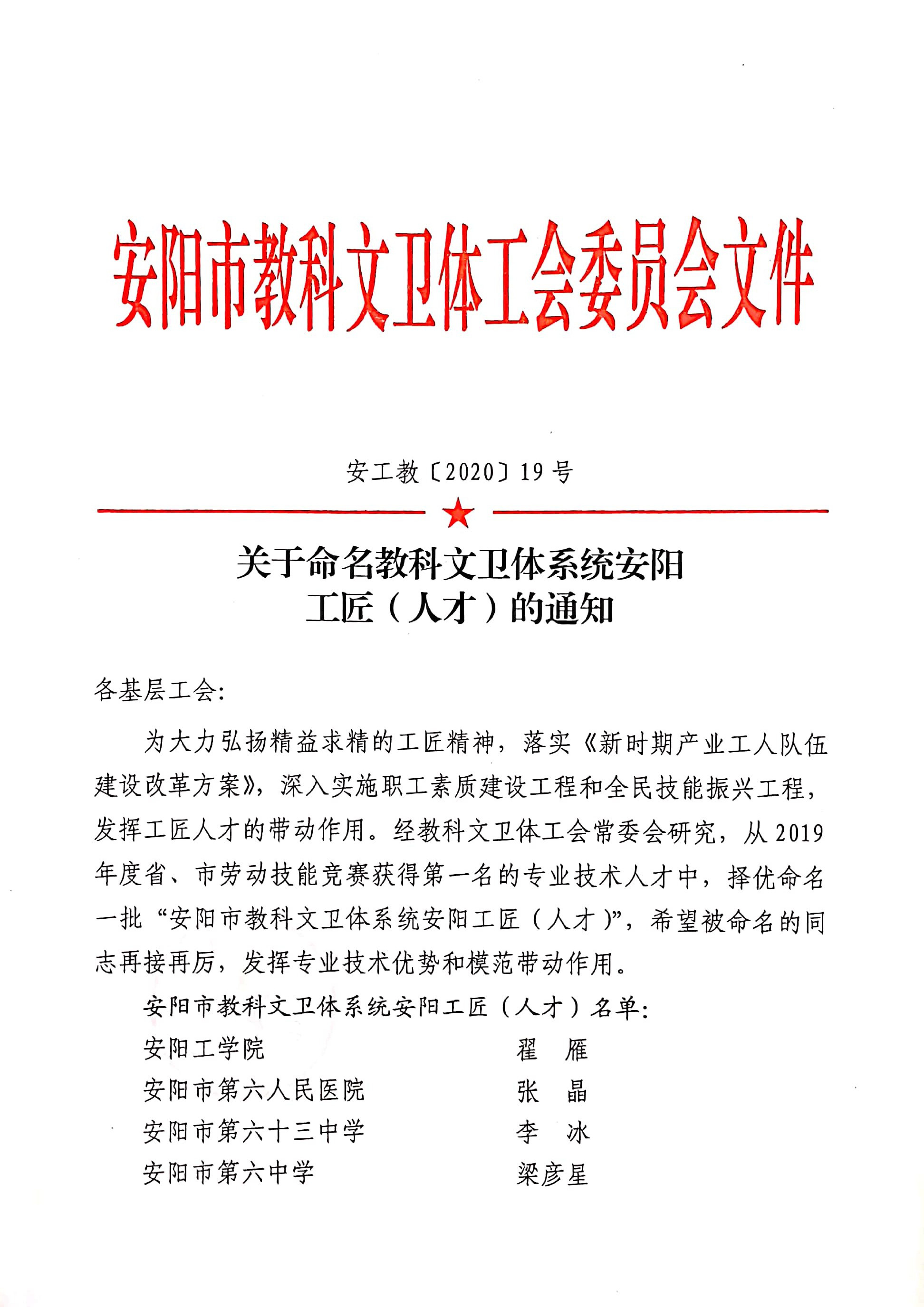 2020年5月27日上午,“2020年安陽(yáng)市勞動(dòng)模范和先進(jìn)工作者表彰大會(huì )”在安陽(yáng)市職工文體活動(dòng)中心隆重召開(kāi)。我院黨員、臨床藥師張美鳳榮獲2020年安陽(yáng)市五一勞動(dòng)獎?wù)?/span>,同時(shí)榮獲安陽(yáng)市教科文衛體系統安陽(yáng)工匠(人才)命名。