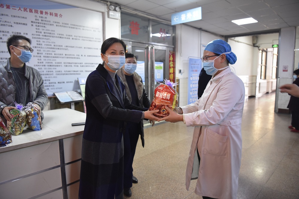 由于疫情原因,團拜活動(dòng)在住院部大廳舉行。院領(lǐng)導為各科室代表送上慰問(wèn)品,并致以節日的祝福和誠摯的問(wèn)候,感謝大家在這個(gè)闔家團圓的日子里堅守工作崗位,并仔細詢(xún)問(wèn)了節日值班和工作情況,叮囑工作人員做好疫情防控,確保醫療安全。院領(lǐng)導對職工們堅持工作崗位的精神和昂揚飽滿(mǎn)的干勁給予高度贊揚。受到慰問(wèn)的干部職工也深切感受到了二醫院大家庭的溫暖,紛紛感謝醫院領(lǐng)導的關(guān)心,表示會(huì )一如既往履職盡責,保證各項工作落實(shí)到位。