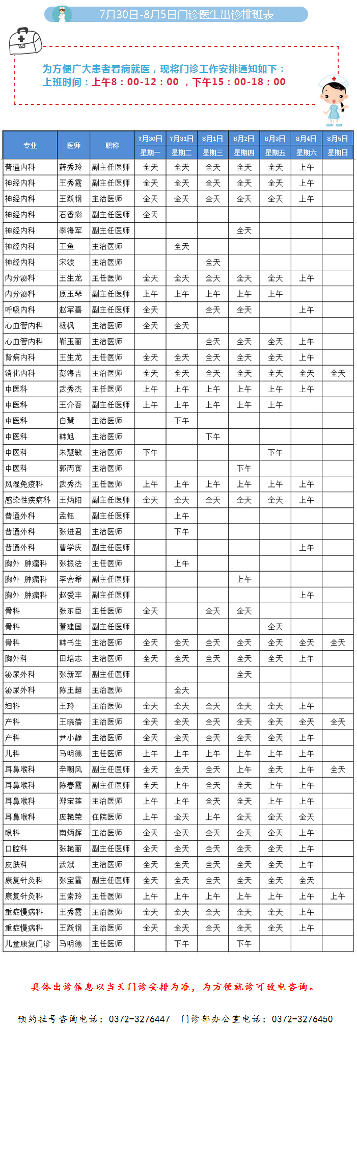 安陽(yáng)市第二人民醫院7月30日-8月5日門(mén)診專(zhuān)家、醫師坐診排班表