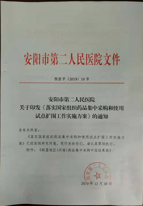 安陽(yáng)市第二人民醫院全面深入落實(shí)“國家組織藥品集中采購和使用試點(diǎn)擴圍方案”。通過(guò)制定方案、政策宣講、公布中選藥品目錄;以及即將實(shí)施的醫患座談會(huì )、讓患者引導患者等多種舉措,推動(dòng)促進(jìn)中選藥品使用,25種中選藥品價(jià)格大幅度降低,使患者享受到最大程度的實(shí)惠。