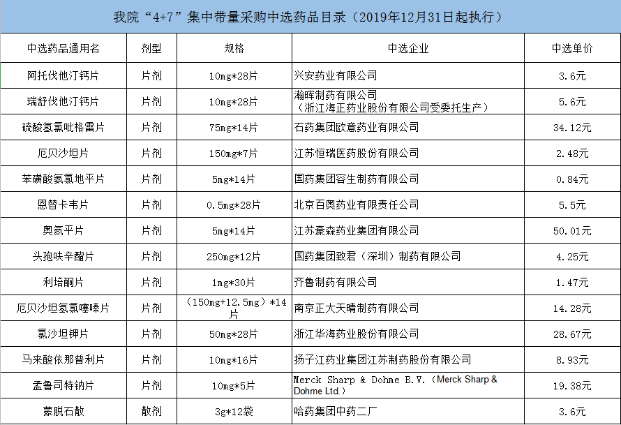 注:中選藥品目錄從2019年12月31日起在我院正式實(shí)施。