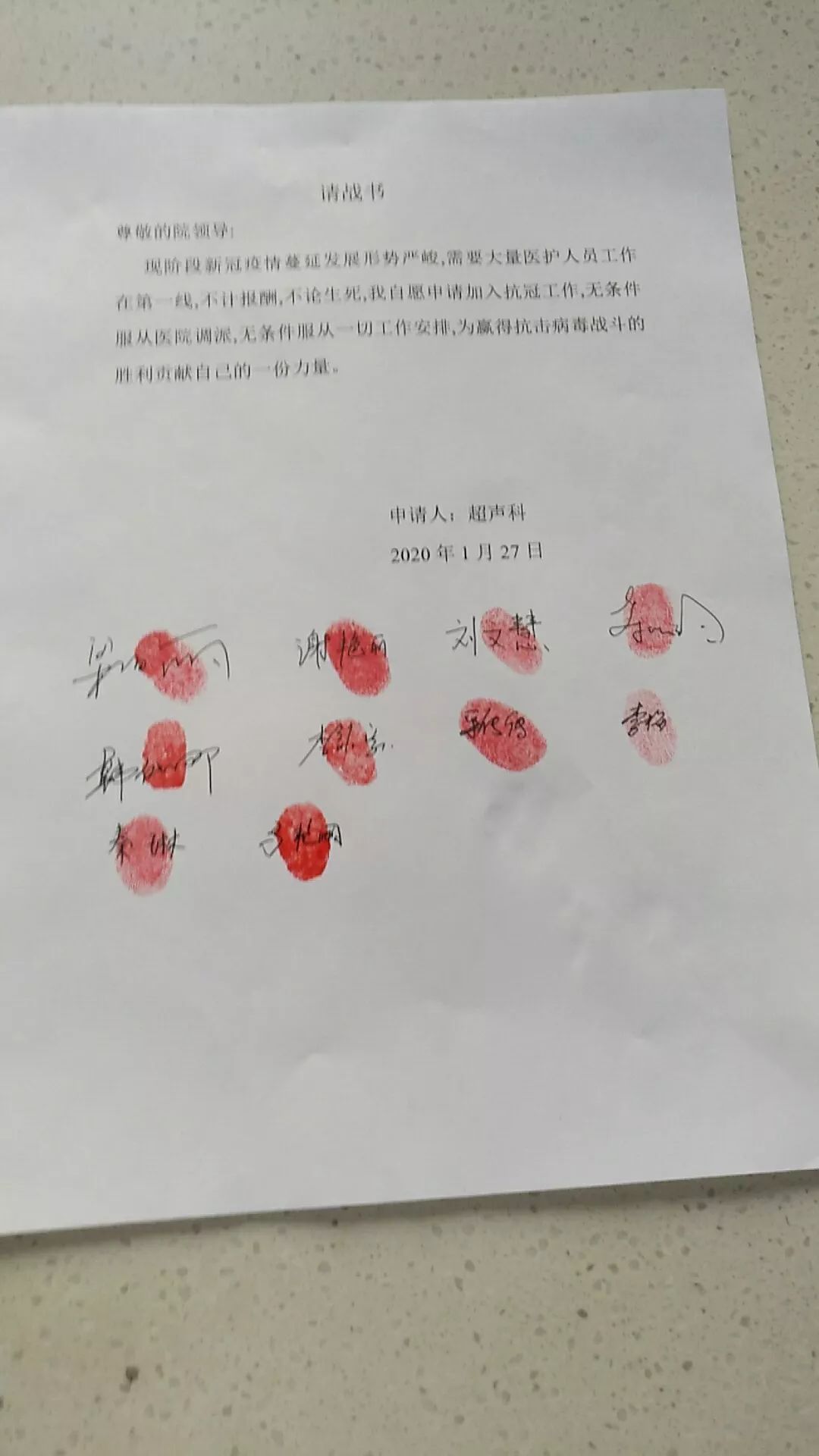 在疫情面前,共產(chǎn)黨員主動(dòng)請纓,到最需要的地方去,而科室醫護人員也不甘落后,紛紛在請戰書(shū)上按下自己的紅手印。門(mén)診支部的科室承擔著(zhù)全院病人的接診、分診、檢驗、檢查之重任,自打響疫情防控阻擊戰以來(lái),全體黨員干部職工不計個(gè)人得失,堅守崗位,積極響應號召,扛起了醫護人員的社會(huì )責任。大疫面前,每個(gè)人都是戰士,必須懂“服從”、懂“配合”、懂“規則”,這場(chǎng)戰斗,堅信我們一定會(huì )打贏(yíng)!