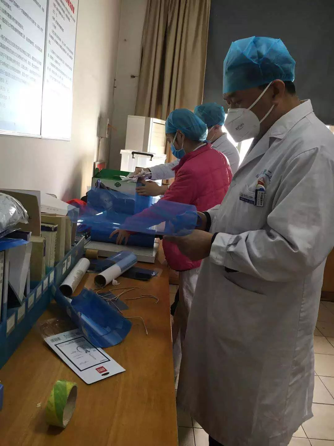 遇到新問(wèn)題,我們積極應對。在防護物資緊缺的情況下,影像科桑主任帶領(lǐng)科室員工用廢棄的放射膠片自制防護面罩。