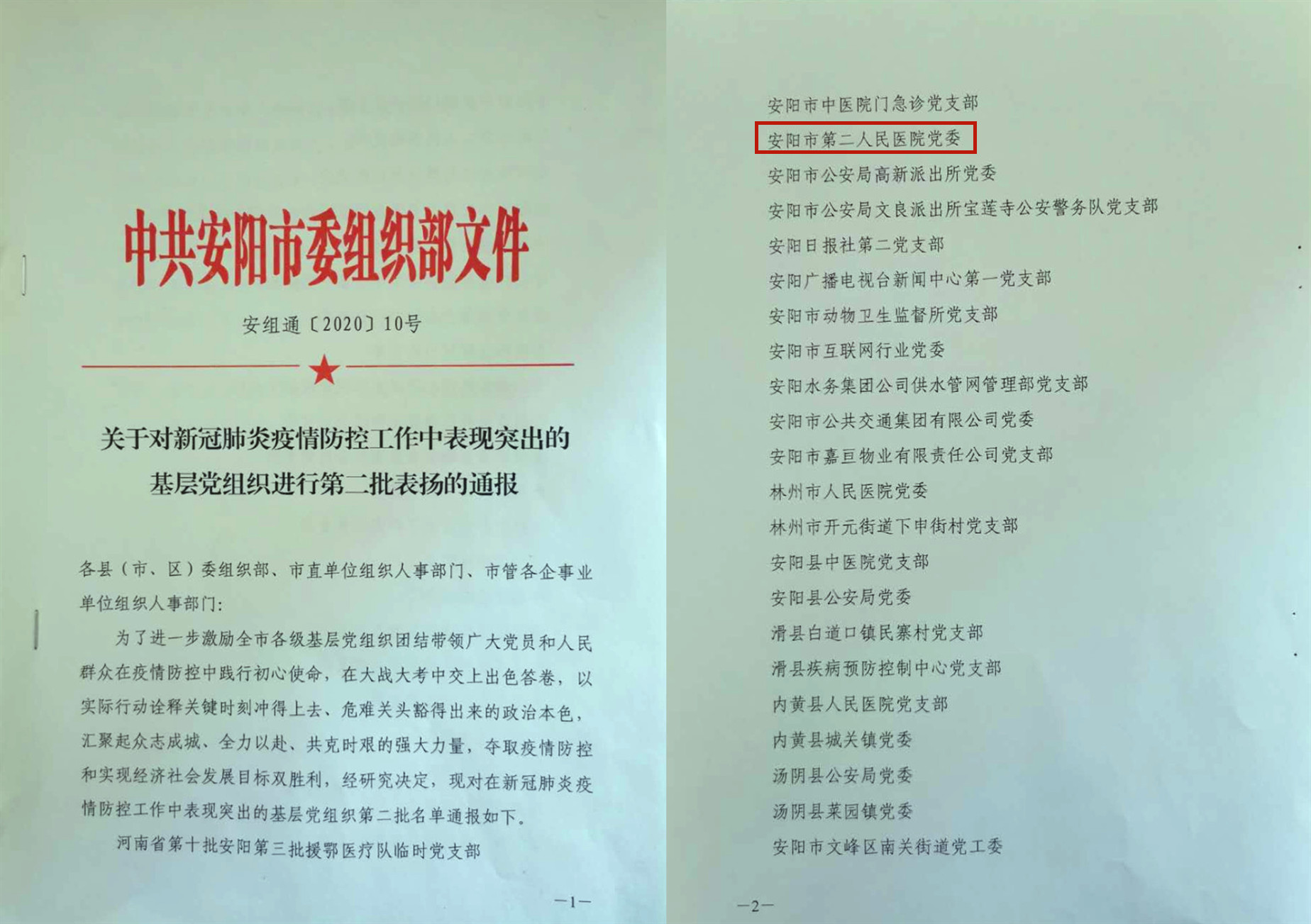 近日,安陽(yáng)市委組織部通報表?yè)P了第二批在疫情防控工作中表現突出的基層黨組織,“安陽(yáng)市第二人民醫院黨委”榜上有名!